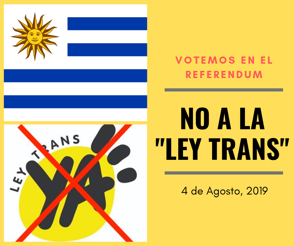 El 4 de agosto, Uruguay tiene la oportunidad histórica de darle un golpe mortal, por medio de su voto, a la campaña mundial de imposición de la ideología género. Ese domingo, los uruguayos irán a las urnas para votar por un prereferéndum si se debe derogar la denominada “Ley trans” (Ley 19.684), la cual fue promulgada el 10 de octubre de 2018. Vayan todos a votar por el bien de la patria. La oficina de Naciones Unidas en Uruguay manifestó su preocupación por la iniciativa de pre-referéndum para derogar la ley, si, preocupados porque atenta contra la agenda globalista de la ONU.