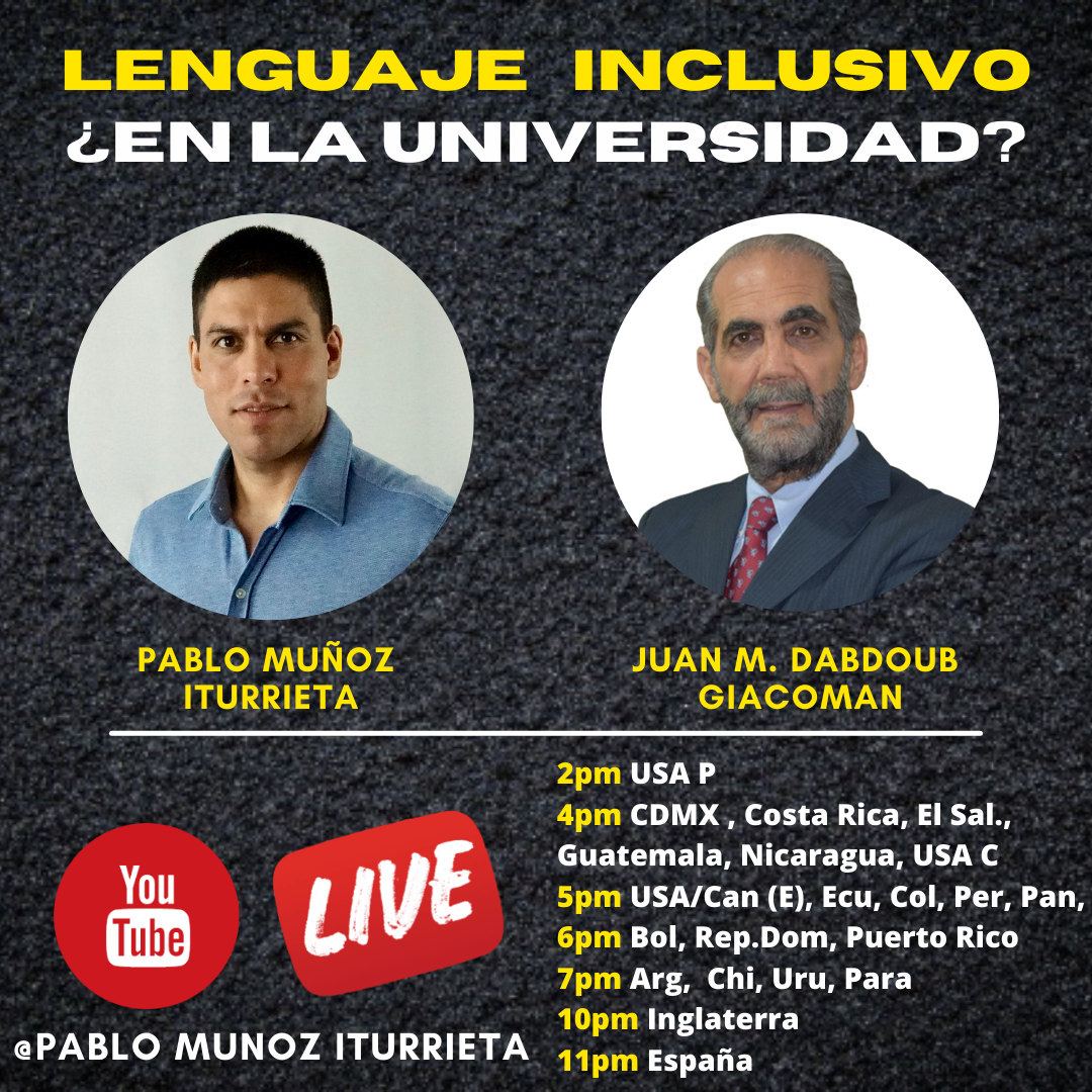 Este martes 19 tendré una conversación interesantísima con Juan Dabdoub, presidente de “ConFamilia” de México. Hablaremos de la imposición ideológica del lenguaje inclusivo en la universidad y en el sistema educativo. No se lo pierdan (poner notificación).