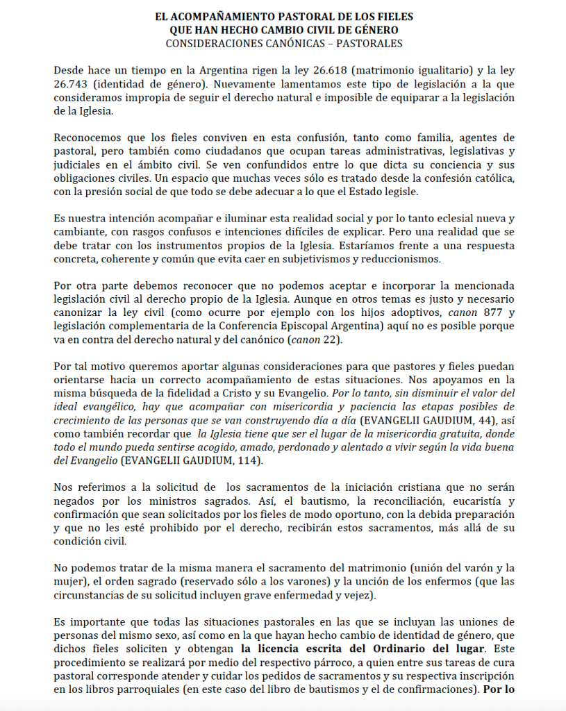 En una carta y documento oficial, la Conferencia Episcopal Argentina anuncia la elaboración de un documento de tipo canónico-pastoral práctico para que el Obispo tenga los elementos suficientes para explicar a los párrocos el procedimiento a emplear con relación a ciertas leyes como las uniones del mismo sexo, la identidad de género, recepción del matrimonio o del sacramento del bautismo y la confirmación.