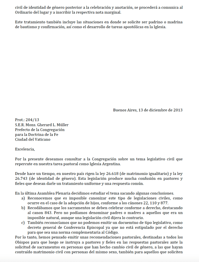 - Carta de Mons. José María Arancedo al Cardenal Gherard L. Müller, Prefecto de la Congregación para la Doctrina de la Fe, donde se consulta acerca del proceder con respecto a la ley 26.618 (de matrimonio igualitario) y la ley 26.743 (de identidad de género). La carta está archivada como Prot. N° 204/13, del 13 de diciembre de 2013. Al ser dirigida al organismo que vela por la doctrina, los obispos argentinos hacen gala de buena doctrina y prometen un documento «prometedor».