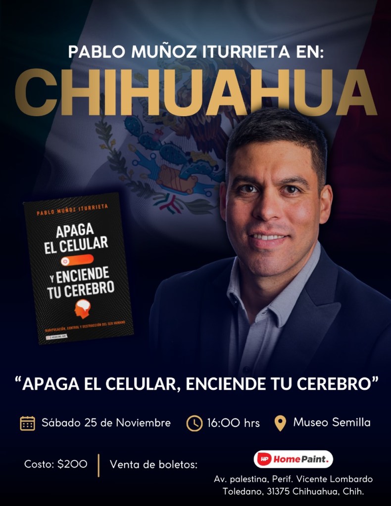 Queridos amigos, estaré en tres ciudades de México en este mes de noviembre presentando mi último libro «Apaga el celular y enciende tu cerebro: Manipulación, control y destrucción del ser humano«. Los invito a participar de estos eventos e invitar a sus amigos y seres queridos. ¡Nos vemos!